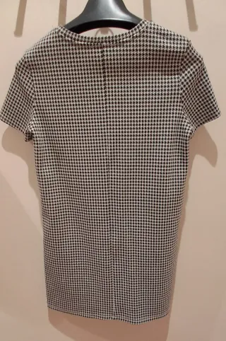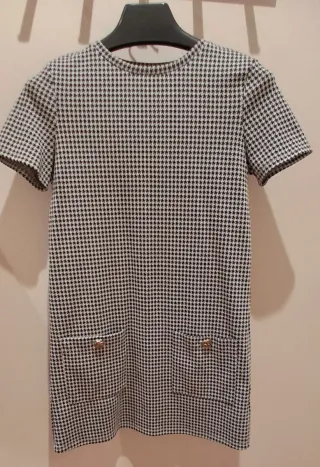 Vestido de la marca Zara con un estampado clásico. - Diseño de pata de gallo. - Dos bolsillos delanteros con detalle de botón dorado. - Manga corta.