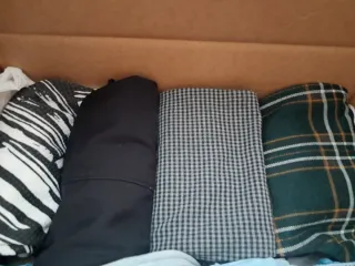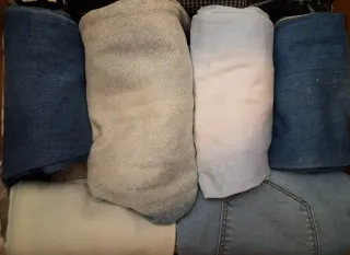 Conjunto de pantalones vaqueros y de vestir: - Variedad de tonos vaqueros. - Textura de denim. 10 pantalones tallas 32 y 34 de varias marcas.