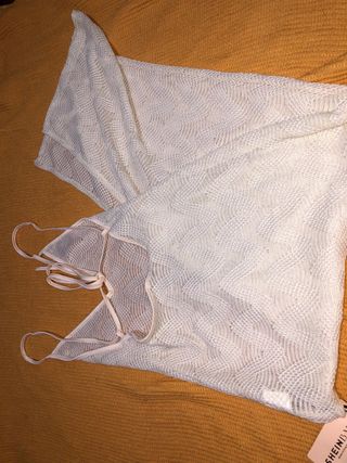 Vestido de playa con un diseño tejido y escote en V. - Tejido calado con patrón de ondas. - Tirantes finos ajustables. - Largo hasta la rodilla.