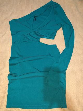 Vestido de fiesta con un diseño moderno y atrevido. - Escote asimétrico. - Detalle de corte en la cintura. - Manga larga. - Tejido acanalado.