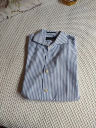 Camisa de vestir de caballero con un diseño de rayas verticales en tonos azules y blancos. Perfecta para ocasiones formales o para el día a día. Puesta en una ceremonia - Cuello clásico. - Cierre de botones. - Manga larga.