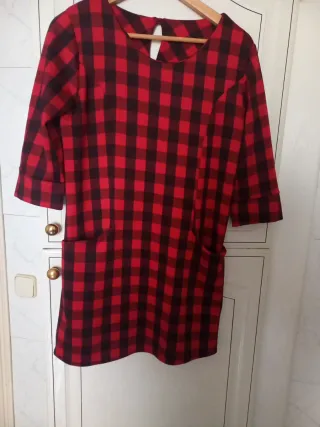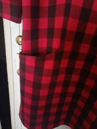 Vestido de cuadros con un diseño moderno y cómodo. - Tejido a cuadros rojos y negros. - Manga corta. - Bolsillos laterales. - Abertura en la espalda con cierre.