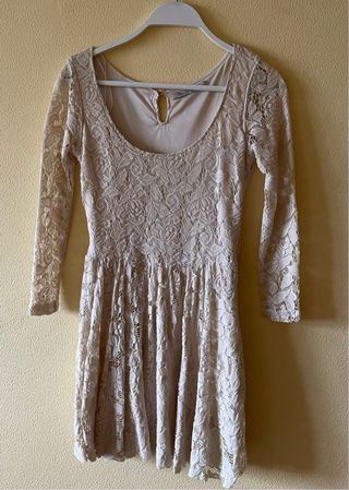 Elegante vestido sin estrenar en color crema, con un diseño que combina lentejuelas y detalles de encaje negro. - Cuerpo del vestido cubierto de lentejuelas. - Cremallera lateral - Adorno de encaje negro en forma de flor en la parte inferior. - Ribete negro en cuello y sisas. Talla pequwño