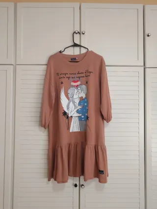 Vestido de manga larga con un diseño romántico y un volante en la parte inferior. - Estampado de pareja besándose con alas y corazón. - Frase El corazón nunca olvida el lugar donde dejó sus mejores besos en la parte superior. - Color base marrón rosado.