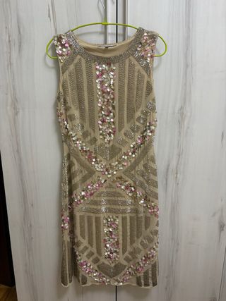 Vestido elegante de El Corte Inglés, talla S, en color nude/beige con bordados y lentejuelas en tonos dorados y rosados. Diseño muy favorecedor, ideal para eventos, fiestas, bodas o celebraciones especiales. Está usado pero en perfecto estado, sin ningún desperfecto, manchas ni roturas. Lentejuelas y bordados intactos. ✔️ Corte recto y elegante ✔️ Tejido ligero y cómodo ✔️ Acabados de calidad ✔️ Estilo sofisticado y atemporal Se vende por falta de uso. Una oportunidad perfecta para llevar un vestido de marca a un precio reducido.