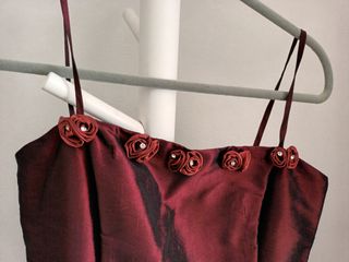 Vestido de fiesta palabra de honor con tirantes añadidos Adornos rosas con piedra en escote Color burdeos Talla 42 Marca Marian Palma Usado 1 sola vez y limpiado en tintorería