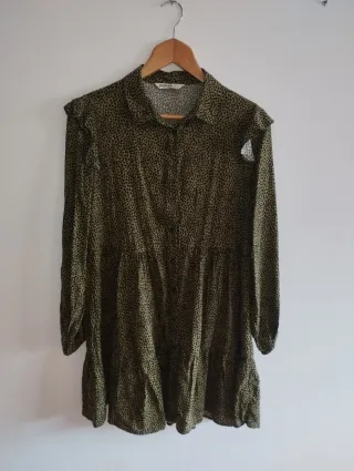 Vestido de Zara con un llamativo estampado de serpiente. Ideal para añadir un toque salvaje a tu armario. - Diseño con cuello en V. - Cierre de botones en la parte delantera. - Mangas largas. - Falda con vuelo y detalle fruncido.
