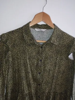 Vestido nuevo con estampado animal print de Lefties. Tiene un diseño con cuello redondo y manga larga. - Estampado de manchas en tonos marrones y negros. - Bajo con volante. - Cierre de botón en la espalda. Talla M No hago reservas Zara.mango.uterque.parfois.sfera.massimo dutti.bimba y lola.pull and bear.shein.primark.pedro del hierro.roberto verino.oysho.stradivarius.sprinfield.berskha.