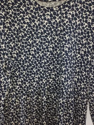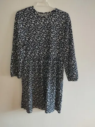 Vestido de Lefties con un bonito estampado floral en azul marino y blanco. Es una prenda sin estrenar, ideal para añadir un toque alegre a tu armario. - Diseño de manga larga. - Cintura elástica para un mejor ajuste. - Largo hasta la rodilla.