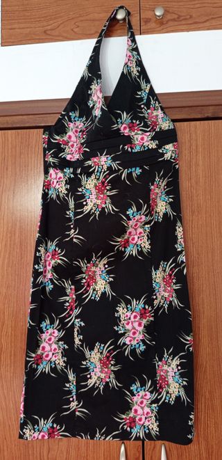 Precioso vestido negro con estampado floral, ideal para cualquier ocasión. Sin estrenar. - Diseño halter. - Estampado de flores en tonos rosas, azules y amarillos. - Largo hasta la rodilla, corte midi - Super elegante y completamente nuevo
