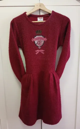 Vestido de punto con un tejido brillante y detalles de pedrería. - Diseño de manga larga. - Cintura marcada con falda plisada. - Bolsillos laterales. - Adorno frontal con corona y lazo. Bolsillos