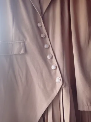Vestido corto de corte clásico y atemporal. - Color beige. - Diseño con botones dorados decorativos. - Falda plisada. - Manga abullonada en los hombros. - Original y elegante.