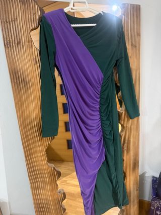 Vestido elegante de la marca Elephant Rooms con un diseño cruzado y drapeado. - Tejido principal en color verde oscuro. - Detalle drapeado en color morado. - Mangas largas.