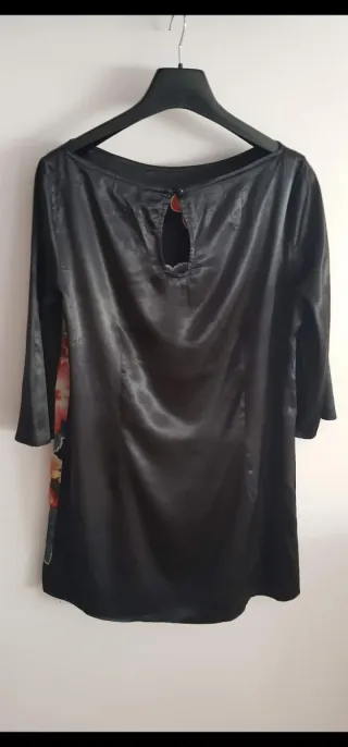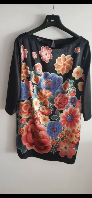 Vestido blusón con un estampado floral vibrante sobre fondo negro. El diseño es llamativo y lleno de color. - Mangas tres cuartos. - Cuello redondo. - Cierre de botón en la nuca.