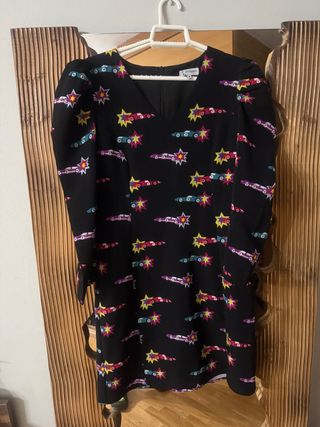 Vestido corto con estampado divertido de coches y explosiones. - Diseño con cuello en V. - Mangas abullonadas. - Estampado multicolor sobre fondo negro.
