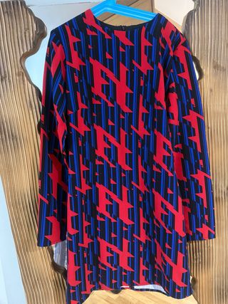 Vestido de manga larga con un llamativo estampado geométrico. - Diseño con líneas verticales azules y rojas. - Corte recto. - Cuello redondo.