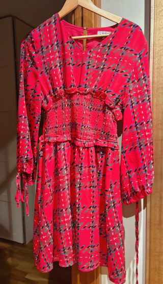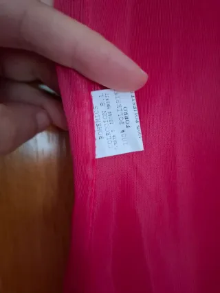 Vestido de color rosa. - Lavado a máquina a 30°C. - No usar lejía. - Planchar a baja temperatura. - Lavado en seco permitido. - Fabricado en España. El vestido esta nuevo solo puesto para un evento, pero tiene una mancha que parece tinta, no he probado a lavarlo. Medidas: 43cm de Sisa a sisa