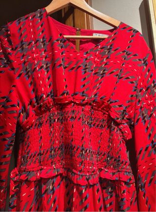 Vestido midi de Zara en color burdeos. Presenta un diseño elegante con detalles fruncidos en la cintura y hombreras sutiles - Escote en pico. - Sin mangas. - Largo midi.
