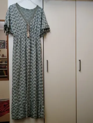 Vestido largo con un estampado geométrico en tonos verdes y beige. Tiene un escote en V adornado con detalles de pedrería y un cordón con borlas. - Mangas cortas con detalle de flecos. - Cintura elástica para un ajuste cómodo. - Bajo con volante.