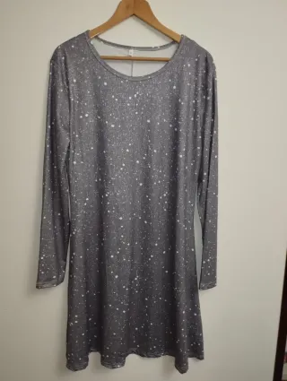 Vestido de mujer con un diseño moderno y cómodo. - Manga larga. - Estampado de puntos blancos sobre fondo gris. - Sin usar.