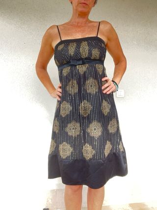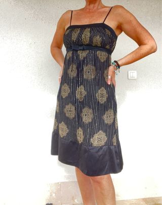 Elegante vestido de cóctel con un diseño llamativo. - Tirantes finos. - Cinturón con lazo. - Estampado de rayas y motivos. - Bajo de satén. Usado en una ocasión. Perfecto estado.Se puede usar con tirantes o palabra de honor. Negro con detalles dorados y cintas de terciopelo. Forro interior y cremallera en la espalda.