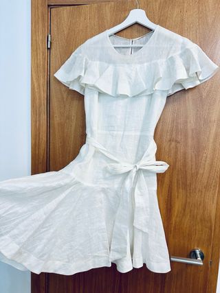 Vestido original de Sandro. Color blanco roto. Talla 40, per va bien para 36-38 también. Se usó solo en una ocasión. Perfecto estado. La capa exterior: 100% lino. Muy ligero y fresquito para los días de calor.