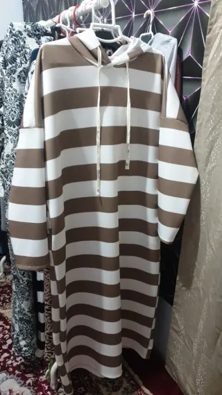 Vestido largo con capucha y cordones, de rayas marrones y blancas. - Diseño a rayas horizontales. - Manga larga. - Capucha con cordones.