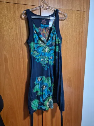 Vestido de tirantes con un estampado floral vibrante y llamativo. - Diseño con escote en V. - Detalle de flores en tonos azules y verdes. - Largo hasta la rodilla.