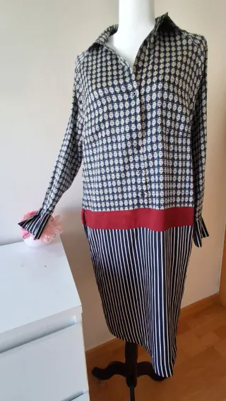 Vestido de la marca Purificación García con un diseño original y moderno. Como nuevo, talla 40, medidas largo 1,03cn y 53cn de sisa a sisa, precioso, y cómodo, oportunidad. (13) - Estampado geométrico en la parte superior. - Banda de color rojo en la cintura. - Falda con rayas verticales. - Mangas largas con volantes en los puños.