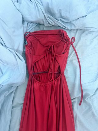 Vestido de fiesta de la marca Lipsy London, con un vibrante color coral y un diseño elegante. - Escote cruzado en la espalda. - Adorno de lazo grande delante. - Falda con ligero vuelo y corte asimétrico. - Tirantes finos. - Cierre de cremallera en la espalda.