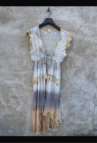 Vestido playero de la marca Purificación García con un diseño vibrante y fresco. Nuevo con etiqueta, no se llegó a estrenar, medidas largo 1,05cn delante y 1,14cm atrás y 90cm ancho, espectacular. (19) - Estampado geométrico en tonos azules y blancos. - Detalles en amarillo en los laterales. - Cuello en V con cordones y borlas. - Corte holgado y cómodo.