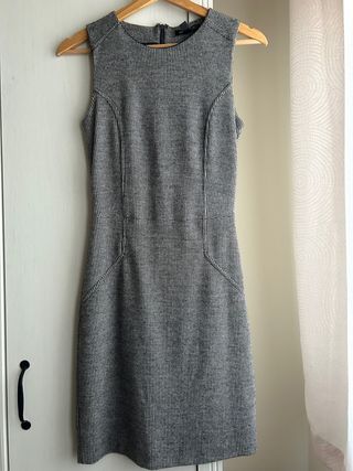 Vestido de punto gris, ideal para el invierno. Presenta un diseño con diferentes texturas y estampados. - Manga larga. - Largo hasta la rodilla. - Cuello redondo.