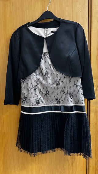 Elegante vestido de ceremonia con chaqueta - Diseño con encaje floral. - Falda plisada. - Detalles de cinta.