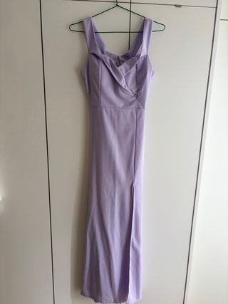 Vestido largo en color malva, ideal para eventos especiales. - Diseño elegante con escote cruzado. - Abertura lateral en la falda. - Tirantes anchos.