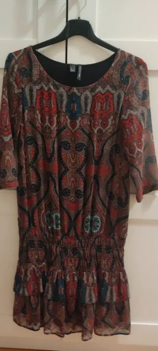 Vestido con estampado animal print y detalles de encaje. Puesto una vez. - Mangas acampanadas con encaje. - Cintura elástica y escote ajustable con cordón. - Volantes en la falda con encaje y forro. Haz pack mínimo de 6€ para envío.