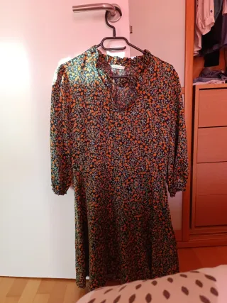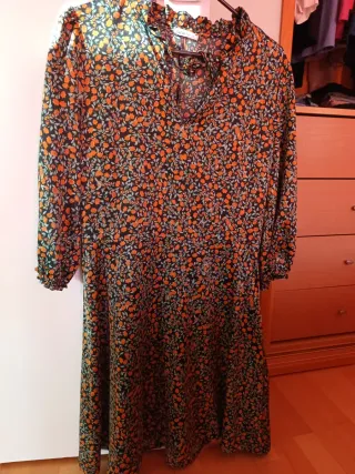 Vestido de punto con un divertido estampado de naranjas. - Diseño oversize. - Manga larga. - Cuello redondo. Está en muy buen estado. Muy cómodo de llevar. Talla única. Se lava en lavadora. Mido 1'60 y me llega a la rodilla.Está en muy buen estado. Tiene un pequeño defecto de costura en parte de atrás del cuello que no se suelta (última foto)