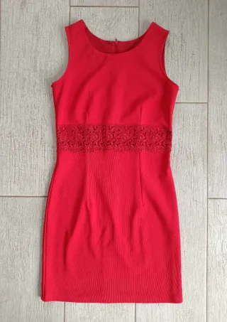 Elegante vestido de color rojo, con un diseño que realza la figura. Talla en Francia 36. Con el elastan. - Detalle de encaje en la cintura. - Tejido con textura acanalada. - Corte recto.