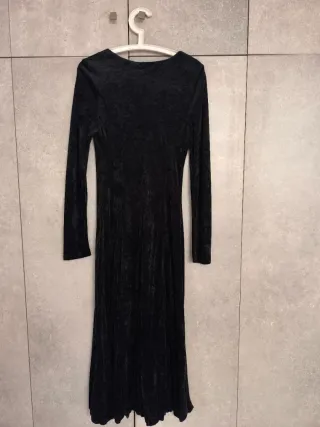 Vestido elegante de manga larga, ideal para eventos especiales. - Escote pronunciado en V. - Cintura elástica fruncida. - Falda con vuelo y detalles plisados. - Puños abotonados.