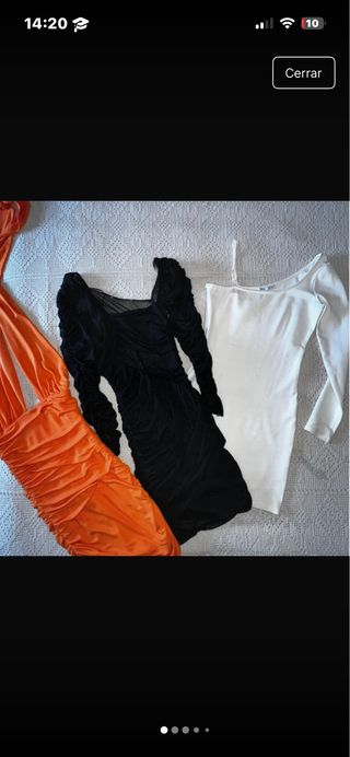 Lote de tres vestidos de Zara. Renueva tu armario con estas prendas. - Vestido negro con mangas abullonadas y escote cuadrado. - Vestido naranja con fruncidos y tirantes. - Vestido blanco asimétrico de manga larga.