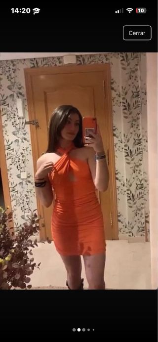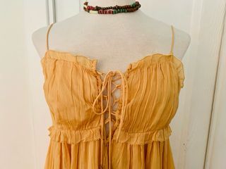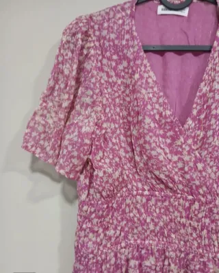 Vestido de escote pico y tirantes finos cruzados en espalda. Detalle de acabados con volantes. Forro interior. Cierre lateral con cremallera oculta en costura. Talla XS y S disponibles Nuevo con etiquetas Pvp 45,95€