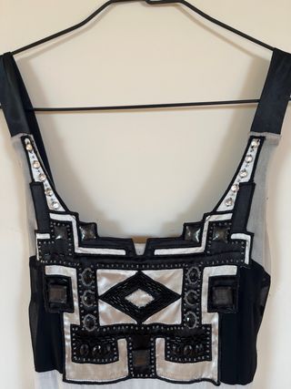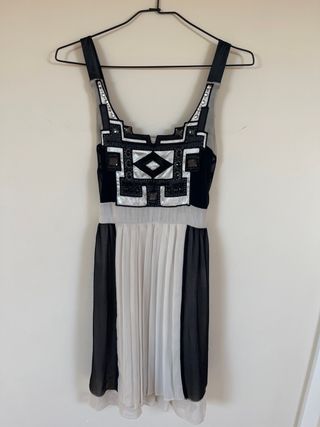 Elegante vestido de gasa con detalles en blanco y negro, ideal para eventos especiales. Su diseño combina sofisticación y un toque moderno. - Tejido ligero de gasa. - Adornos geométricos en el corpiño. - Falda plisada con paneles. - Diseño bicolor.