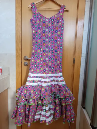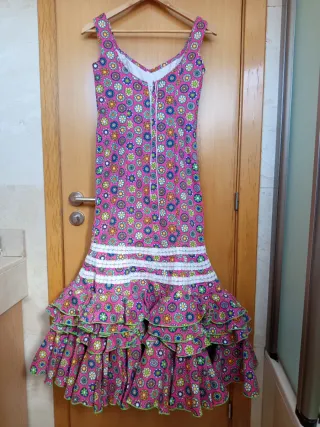 Vestido de flamenca para niña con un bonito estampado floral. Las medidas son las que pone de pecho cadera y largo se puede sacar un poco y meter poco uso No pesa mucho - Diseño con volantes. - Mangas con volantes. - Largo hasta los tobillos.