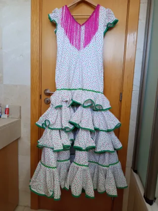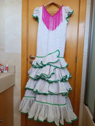 Vestido de flamenca para niña con un divertido estampado de lunares. Vestido flamenca con medidas en las fotos pecho cadera y largo se puede sacar y meter un poco poco uso - Diseño con volantes. - Adornado con flecos rosas en el escote. - Mangas cortas con volante. - Remates verdes en los volantes y mangas.