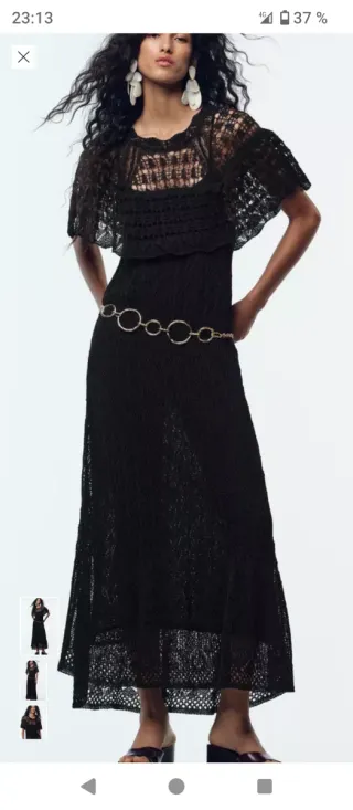 Vestido largo de punto con un diseño calado y elegante. - Tejido ligero y transpirable. - Detalle de cinturón de eslabones dorados. - Largo hasta los tobillos.
