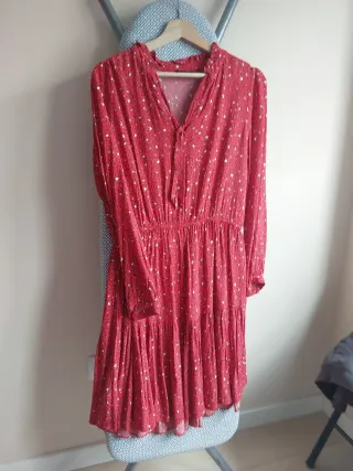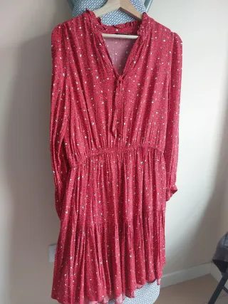 Vestido de la marca Kookai con un estampado floral en tonos rojos y blancos. Presenta un cuello con lazada y un corte elástico en la cintura que le da forma. - Diseño con volantes en la falda. - Manga larga. - Cuello con volante y lazada.