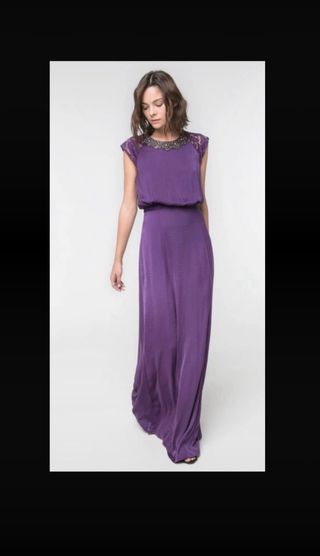 Elegante vestido largo de Mango, ideal para ocasiones especiales. Cuenta con un diseño sofisticado y un tejido con textura sutil. - Detalle de pedrería en el cuello. - Mangas cortas con encaje. - Cintura elástica para un ajuste cómodo.