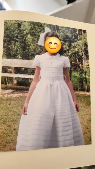 Vestido de comunión con un diseño delicado y elegante. - Mangas abullonadas. - Cuello Peter Pan. - Falda con varias capas de tela. - Detalles de cintas horizontales en la falda.