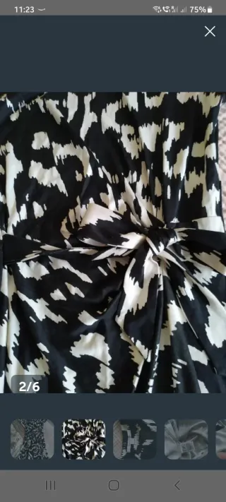 Precioso Vestido de punto de seda 100% estampado abstracto en negro y blanco, frunce lateral con lazada ajustable, manga corta, sin uso. Súper elegante y atemporal talla 4 americana, como una 38 española medidas de hombro 37 cm, sisa 40 cm, y largo 91 cm
