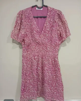 Vestido corto con estampado floral y detalles brillantes. Tiene un corte cruzado en la parte delantera y goma en la cintura para un ajuste favorecedor. - Mangas cortas abullonadas. - Escote en V. - Estampado floral sobre fondo rosa.