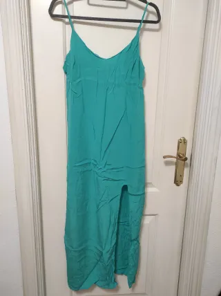 Vestido largo de tirantes finos y regulables con un elegante escote en V y una abertura lateral. A estrenar.